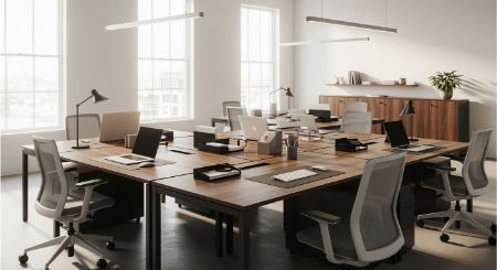چیدمان دفتر کار پیام مهمی درباره هویت برند و ارزشهای سازمان منتقل میکند. میزهای اداری مدرن و مینیمال نشاندهنده بهروز بودن، ساختار منظم و نگاه آیندهنگر شرکت هستند و این امر تأثیر مستقیمی بر انگیزه کارکنان و برداشت مشتریان دارد.